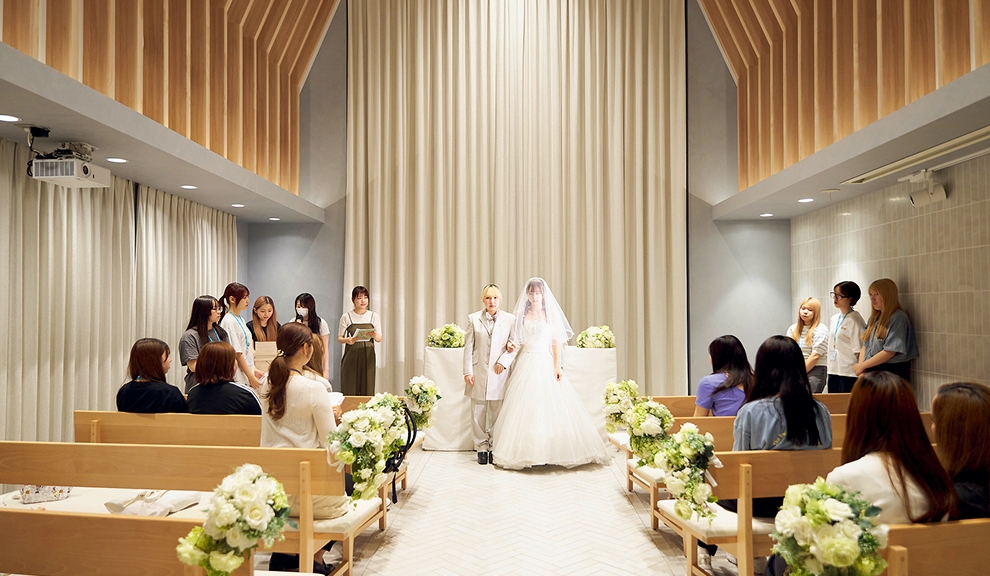 結婚式場さながらの施設で、実践的な授業が日常的に受けられます。新郎新婦さまを募集し、本物の結婚式を執り行ったことも。開放的なエントランスホールは、生徒たちの憩いの場にもなっています。