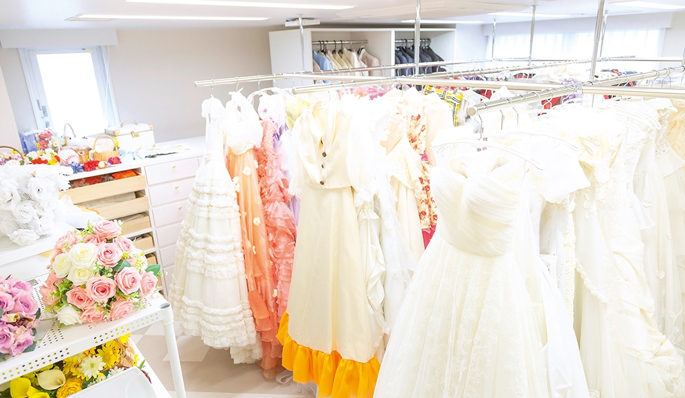 色とりどりのドレスやジュエリーが豊富にそろうドレス実習室。ドレスのフィッティングや着付けの授業などで使用します。