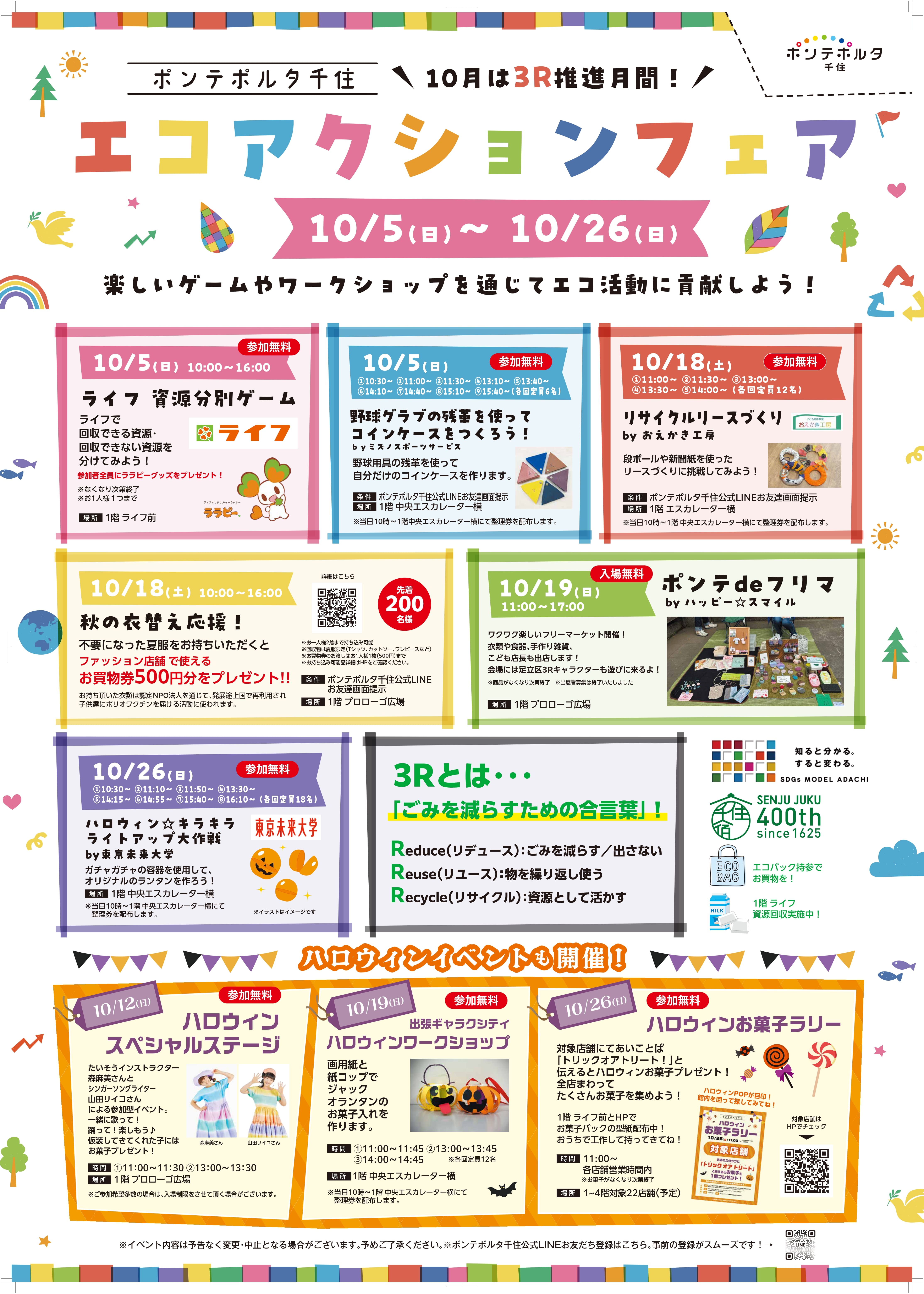 三菱地所プロパティマネジメント株式会社が運営するポンテポルタ千住で、10月5日~26日まで開催された「エコアクションフェア」にて、最終日の10月26日(日)に東京未来大学の地域連携推進委員会が企画に協力し、廃材を利用しハロウィンをテーマとした体験型ワークショップを行いました。