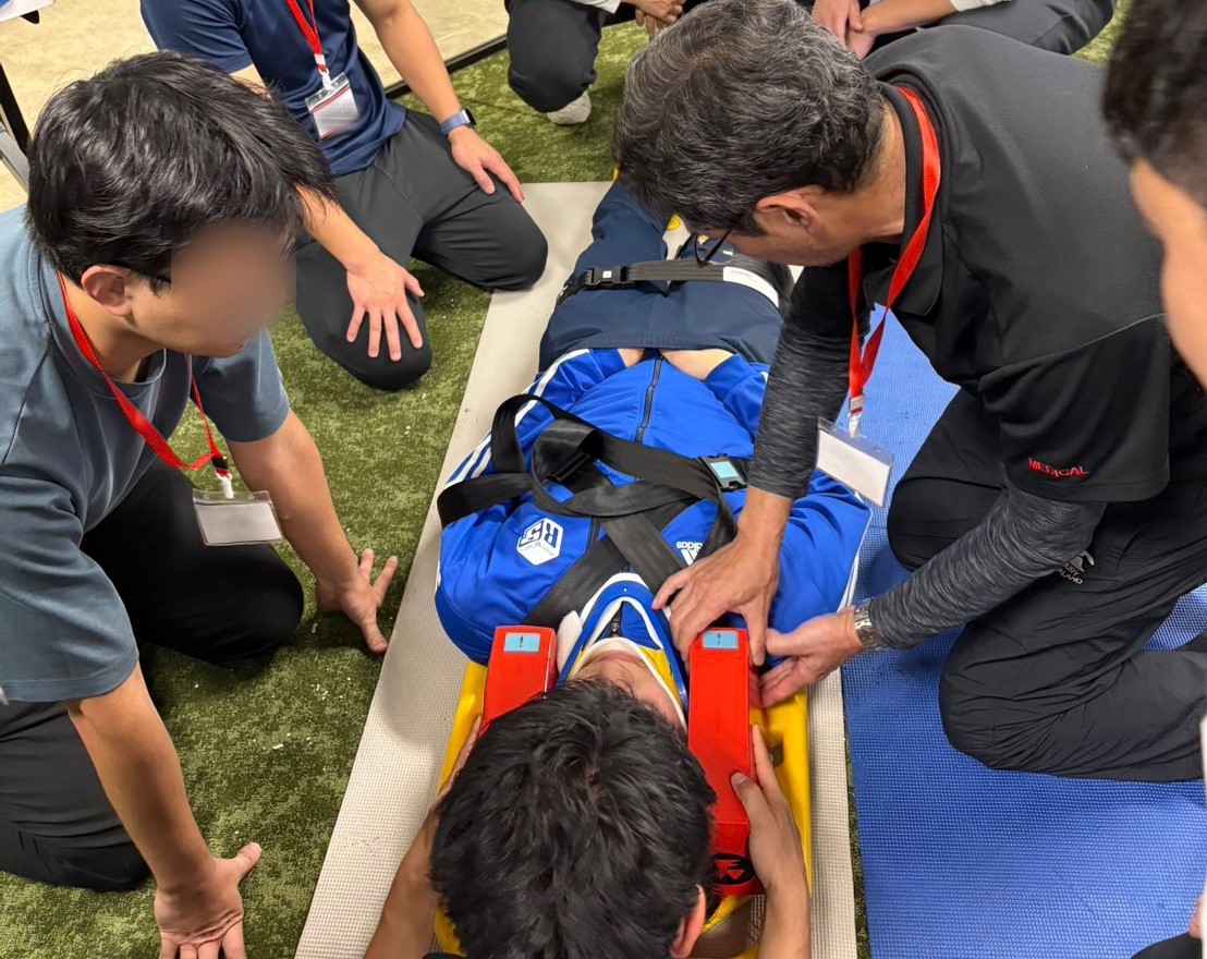 本講習は、スポーツ現場で起こりうる外傷や急病に対し、病院到着前の段階で迅速かつ適切な処置を行うための実践的プログラムです。当日は、ラグビー競技に携わるチームドクターやチームトレーナーなど、24名の医療従事者が参加し、グラウンドや競技場を想定したリアルな状況設定のもと、シナリオ形式の実技が行われました。