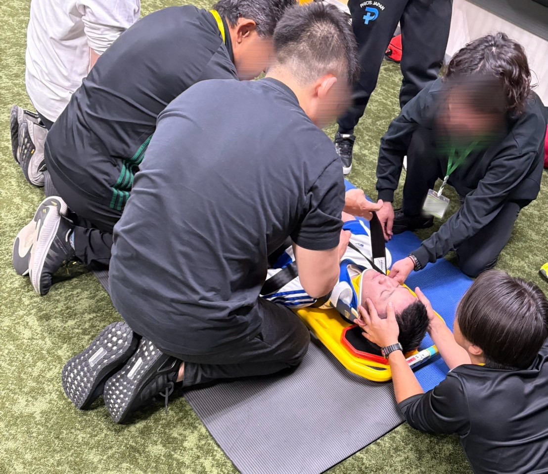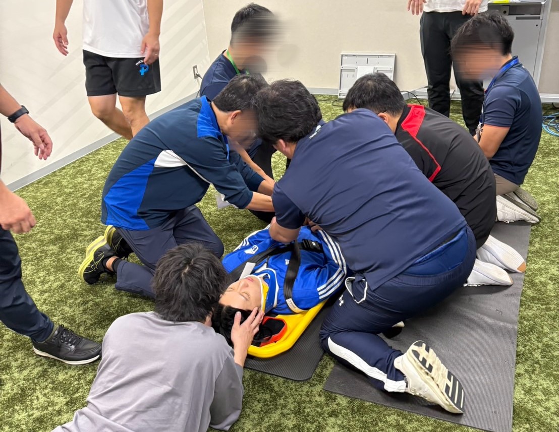 学生たちは傷病者役として各シミュレーションに参加し、受講者の初期評価や搬送練習のリアリティ向上に大きく貢献しました。実際のスポーツ現場を想定した緊迫感のある環境で、救護する側・される側の双方の視点を体験することで、将来アスレティックトレーナーとして求められる判断力・連携力・現場対応力を学ぶ貴重な機会となりました。