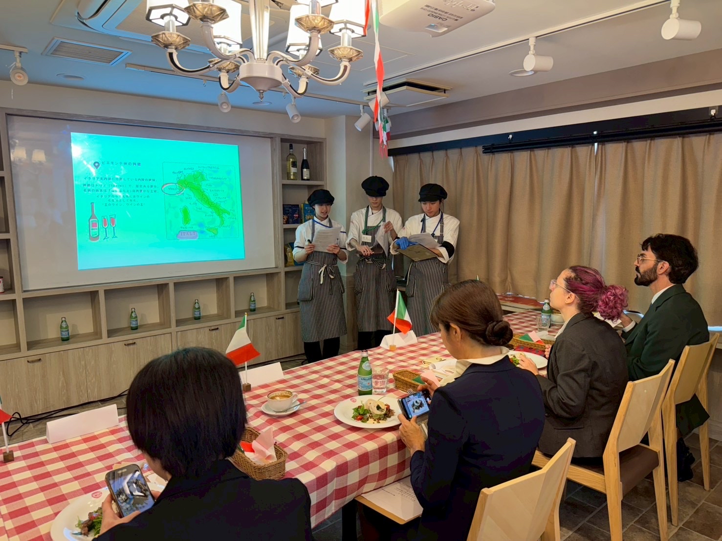 メニュー開発をする難しさを感じましたが、学生のうちからイタリア大使館や企業様に直接プレゼンテーションをさせてもらう貴重な機会をもらえ、頂いたアドバイスやお褒めの言葉は成長につながりますと学生から声があがっていました。