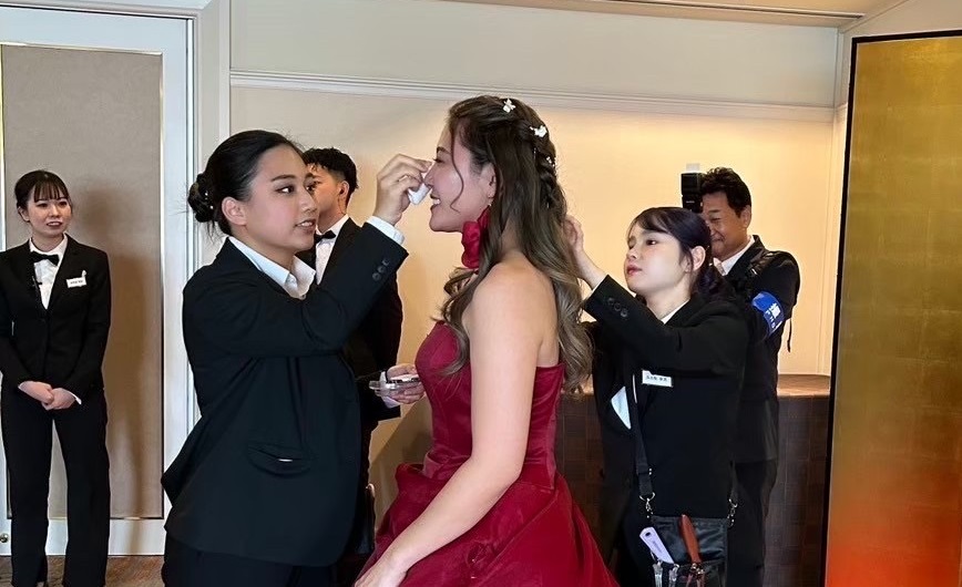 学生がウエディングプランナー、司会進行、ドレスコーディネート、ヘアメイク、サービススタッフまで、役割分担を行いながら現場運営を担当します。授業で培った専門技術だけでなく、チームワークや現場対応力、ホスピタリティマインドを実践の場で養うことを目的としています。
