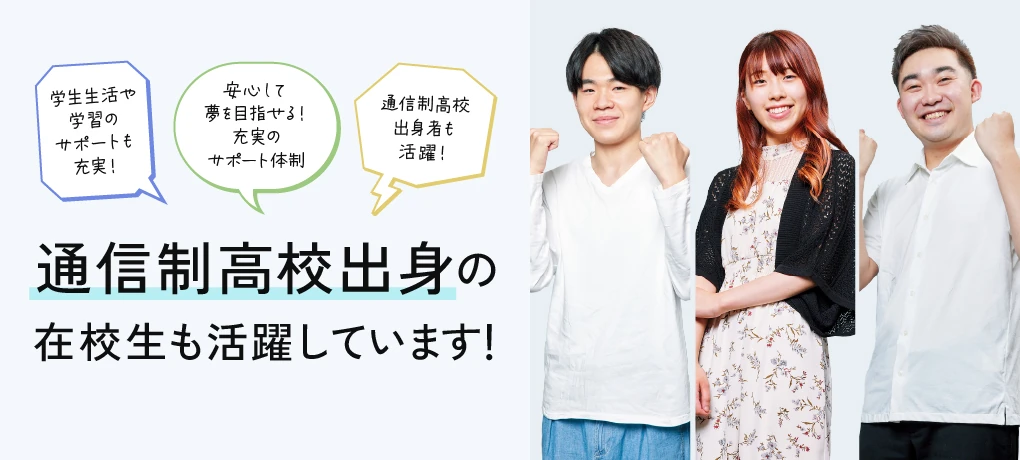 - 通信制高校からの進学に不安はありましたが、実際に入学すると、年齢差があっても受け入れてくれそうな先生方の雰囲気に安心しました。担任制でありながら、担任以外の先生とも話せる環境が整っており、相談しやすい点が魅力です。授業の少ない日はアルバイトや趣味の時間にあて、充実した毎日を過ごしています。進路選びでは自分がやりたいことに向き合い、学ぶ意欲を保てる学校を選ぶことが大切です!