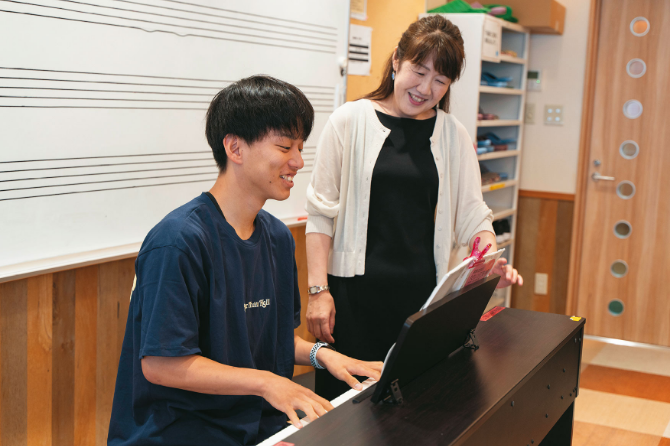 入学者の92%がピアノ初心者です。ピアノを1人1台使用でき、先生が1人ひとりに合わせてていねいに教えてくれるので初心者でも安心です。もちろん、授業以外でもいつでも学校で練習ができ、まったくピアノを触ったことがなかった先輩も入学後3カ月で8曲も弾けるまでに。無理なく、楽しく技術が身に付きます。