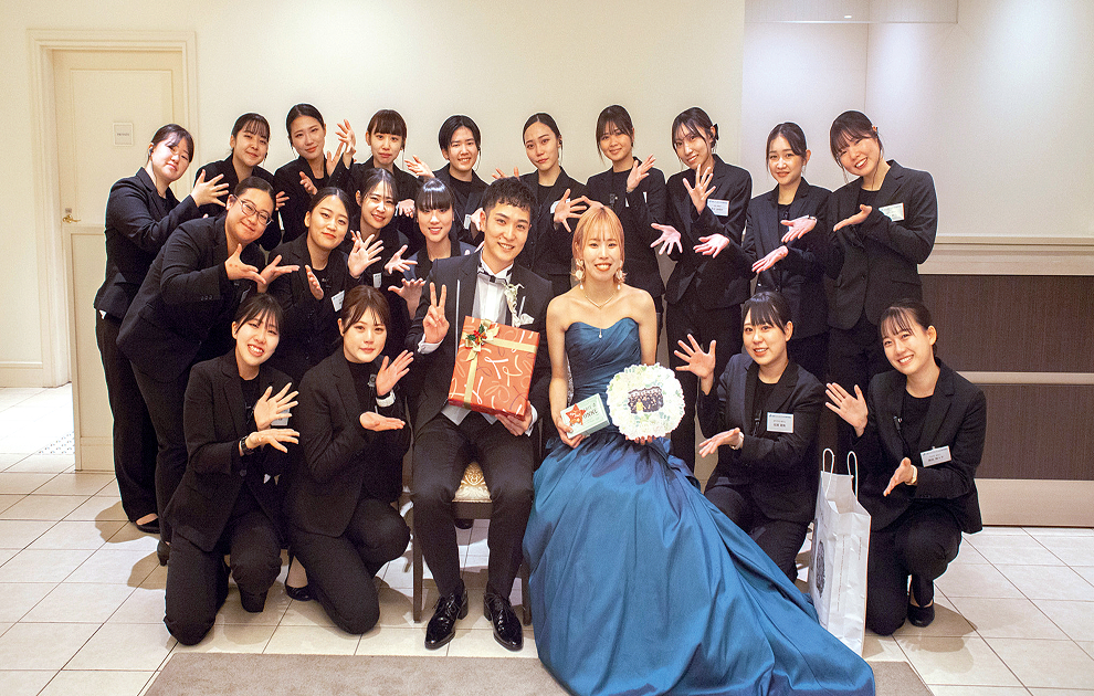 「ブライダルプロジェクト」の授業では模擬挙式を自分たちで一から準備し実施。演出を考えたり構成を練ったりする中で、実践的な知識とスキルが身に付きます。チームの結束力もぐっと高まりました!