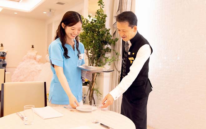 結婚式は、二人を支える大切なゲストに心からの「ありがとう」を伝える場所。格式高いホテルでのフォーマルな席では、きめ細やかなサービスと上質な接客マナー、真心こもったホスピタリティが求められます。本コースでは、ホテル業務の基本と、おもてなしの心をしっかりと修得。国家検定、レストランサービス技能検定の合格に向けたカリキュラムも充実しています。