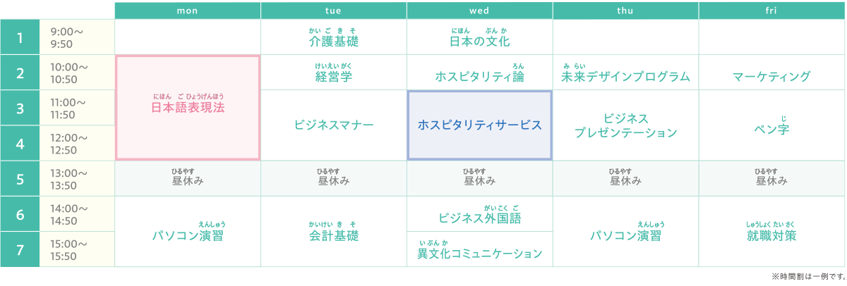 例 )ビジネスマナー、ホスピタリティ、日本文化など - 語学力・コミュニケーション力を強化