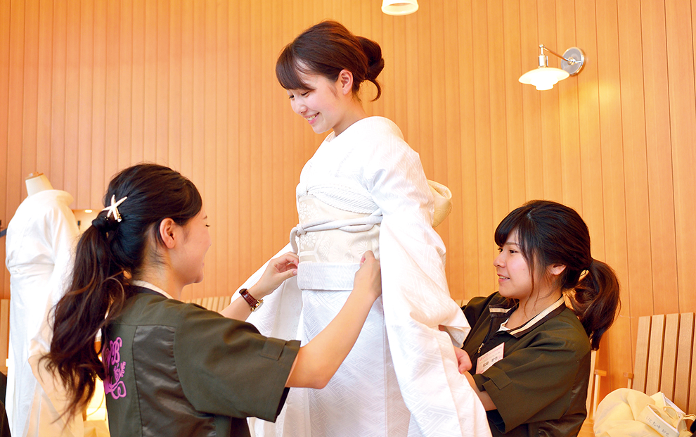 挙式の際に花嫁が着る白無垢や、お色直しの際の色打掛など、特別な着物の着付け方を身につけます。