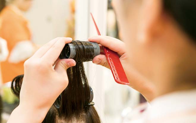 髪の長さやスタイルによってロッドを使い分けてウィッグで繰り返し練習。国家資格に必要な技術を習得します。