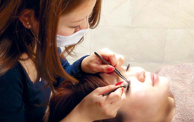 なりたい印象に合わせて長さやカールの異なる人工毛を付けていくまつ毛エクステンション。現代では必須技術です。