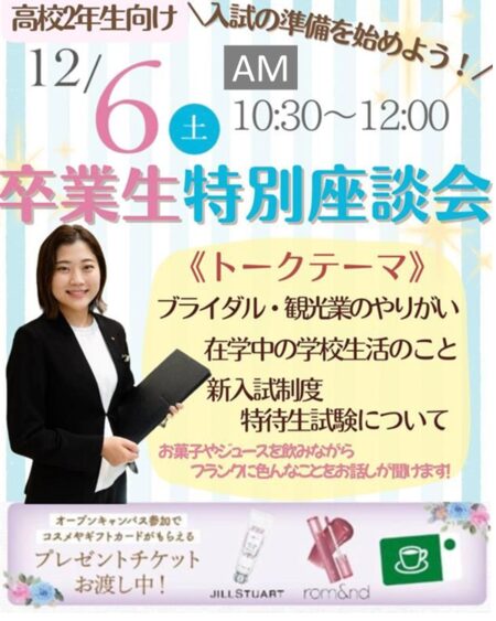 2025.11.29 【高校2年生の方 オススメ!】卒業生特別座談会!開催➁♡♡ 12月 札ブラのオープンキャンパスへGO! 12月6日(土)10:30~12:00 ~高校2年生おススメ!~ブライダルや観光業のお仕事のやりがいが聞ける!【卒業生特別座談会】 プレミアホテル-TSUBAKI‐様より2025年入社の札ブラ卒業生が来てくれます!!<トークテーマ> 【ブライダル・観光業のお仕事のこと、やりがい】 【在学中の学校生活】 【特待生試験について】 ご予約は画像をクリックしてね⇊ ⇊ ⇊
