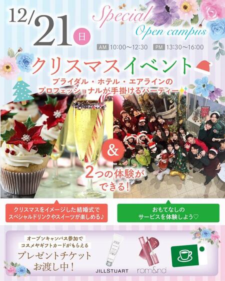 2025.12.05 【高校1・2・3年生 オススメ!】クリスマスイベント 開催 ~2025/12/21(sun)~ 2025年 最後のオープンキャンパス♬クリスマス イベント 12月21日(日)10:00~12:30 or 13:30~16:00 ブライダル・ホテル・エアラインのプロフェショナルが手掛けるパーティー ご予約は画像をクリックしてね⇊ ⇊ ⇊