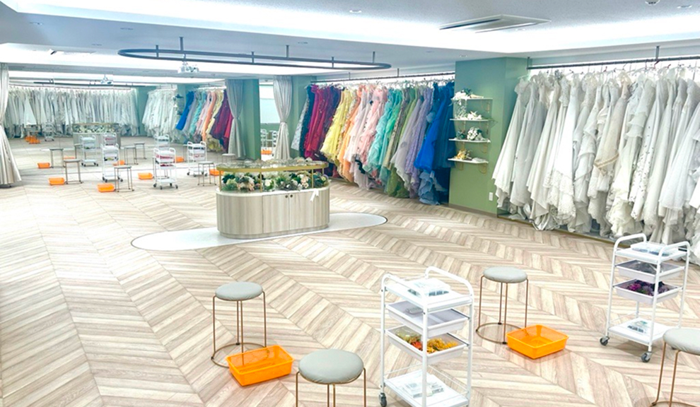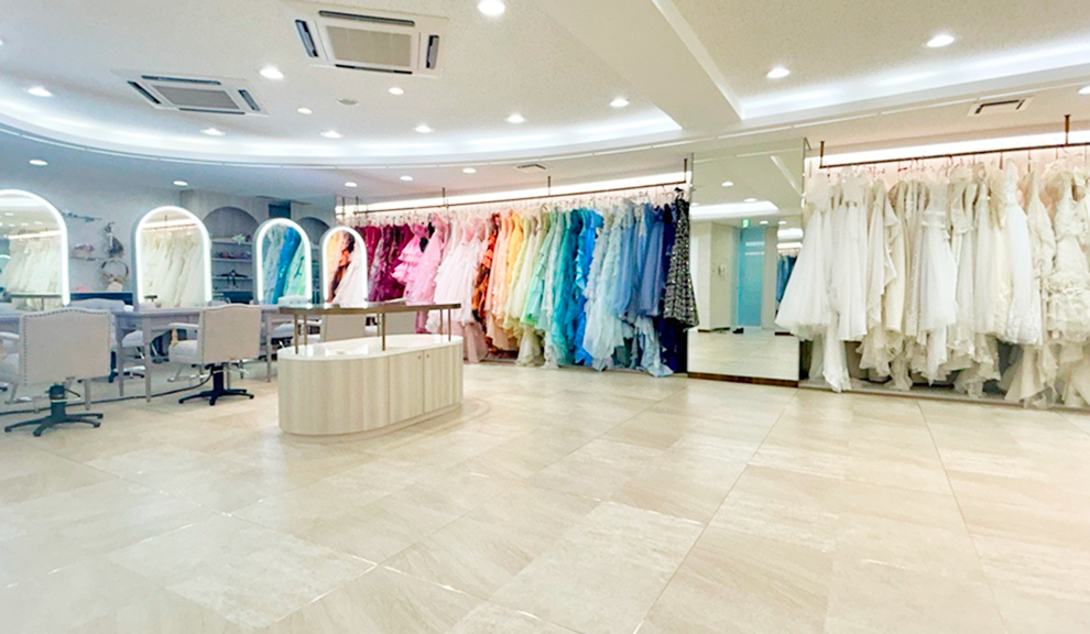 色とりどりのドレスやジュエリーが豊富にそろうドレス実習室。ドレスのフィッティングや着付の授業などで使用します。