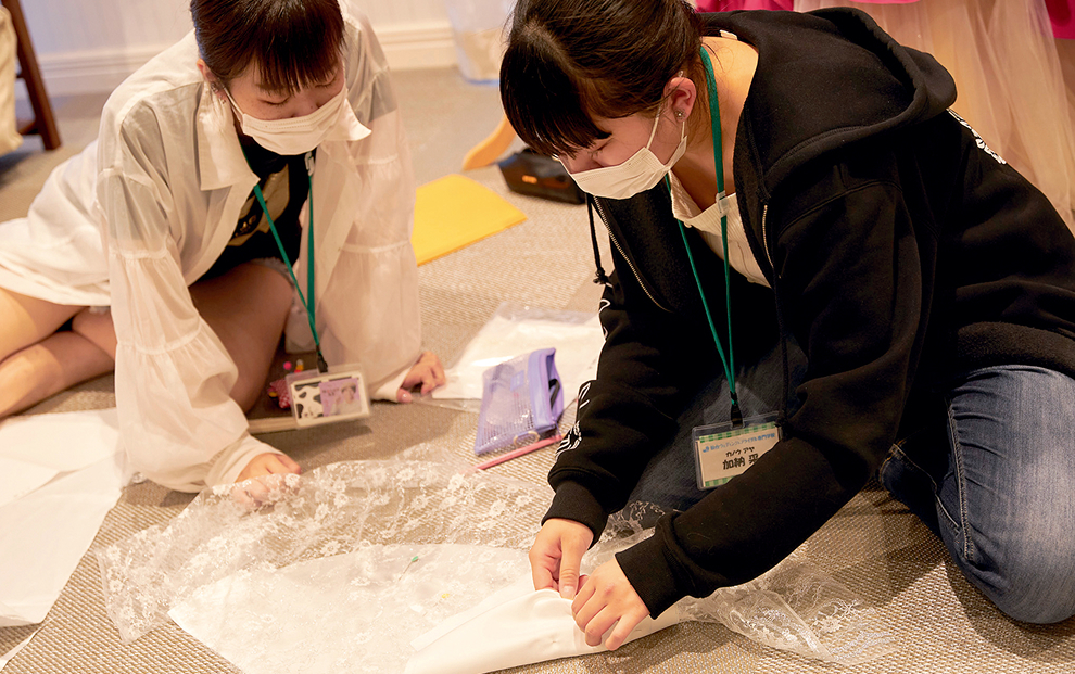 「ドレスコーディネート」ではテーマに合わせた空間作り&ドレス選びを実践。骨格や個性に合わせたスタイリング技術を磨いています。「ドレスソーイング&メンテナンス」ではブライダルコレクションに向けたドレス作りを行います。