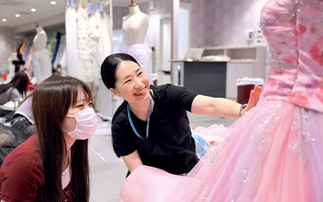 ウェディングドレスをメンテナンスしたり、簡単なアレンジができるような技術を学びます。