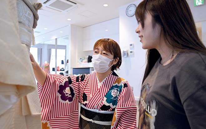 ブライダルに必要な着物に関する知識と技術を学び、在学中に資格取得できる力を育みます。