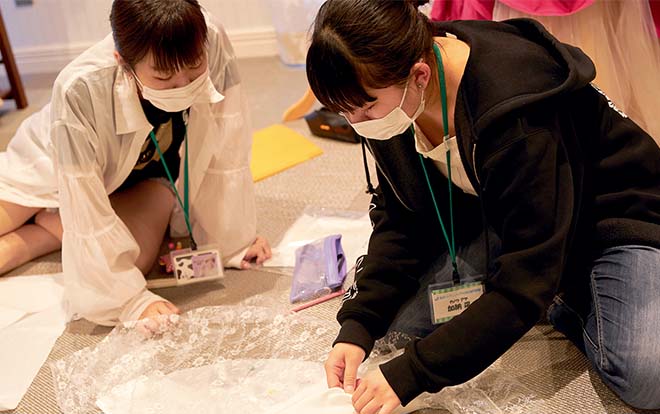 「ドレスコーディネート」では、骨格診断を通してモデルに合ったスタイリングが学べます。「ドレスソーイング&メンテナンス」では裁縫の苦手意識を克服し、メンテナンスの仕方も学びながらブライダルコレクションに向けたドレス作りを楽しんでいます。