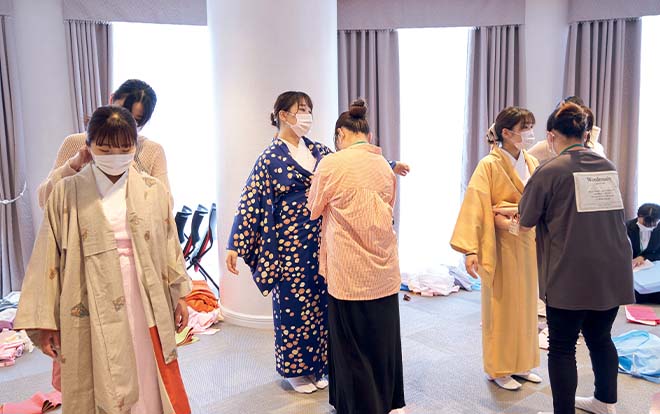 挙式の際に花嫁が着る白無垢や、お色直しの際の色打掛など、特別な着物の着付け方を身につけます。