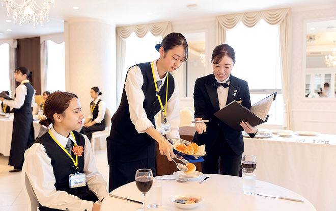結婚式は、二人を支える大切なゲストに心からの「ありがとう」を伝える場所。格式高いホテルでのフォーマルな席では、きめ細やかなサービスと上質な接客マナー、真心こもったホスピタリティが求められます。本コースでは、ホテル業務の基本と、おもてなしの心をしっかりと修得。国家検定、レストランサービス技能検定の合格に向けたカリキュラムも充実しています。