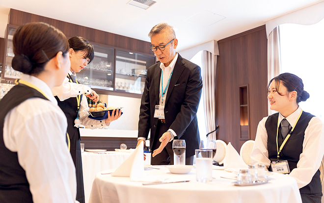 ホテルならではの演出を学ぶとともに披露宴会場をまとめるキャプテンの動きも学習します。