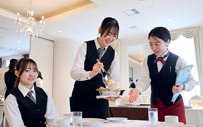 結婚式は、二人を支える大切なゲストに心からの「ありがとう」を伝える場所。格式高いホテルでのフォーマルな席では、きめ細やかなサービスと上質な接客マナー、真心こもったホスピタリティが求められます。本コースでは、ホテル業務の基本と、おもてなしの心をしっかりと修得。国家検定、レストランサービス技能検定の合格に向けたカリキュラムも充実しています。