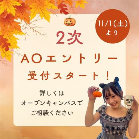 2025.11.11 【高校3年生・再進学の方】11月1日より2次AO入学受付開始 11月1日(土)より、2次AO入学受付がスタートしました! 【2次AOエントリー期間】 2025年11月1日(土)~2026年3月31日(火) ♡少しでも興味があるという方はぜひオープンキャンパスにお越しください♡ ご予約は画像をクリック