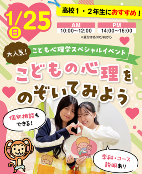 【高校1・2年生向け】☆ 1/25(日)こども心理学 スペシャルイベント☆初恋心理学+こどもの心理をのぞいてみよう✨