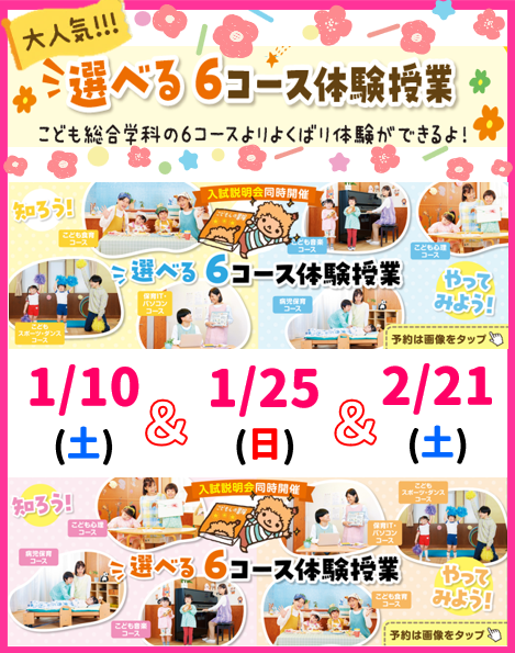 【全学年対象!!!】大人気!選べるNEW6コース体験☆1/10(土)&1/25(日)&2/21(土)☆6コース体験MENUアップデート!!!お得に進路活動☞高校3年生&再進学者の方は入学願書受付中♪