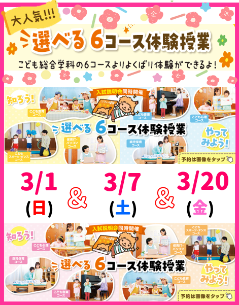 【全学年対象!!!】大人気!選べる6コース体験☆3/1(日)&3/7(土)&3/20(金)☆6コース体験MENUアップデート!!!お得に進路活動☞高校3年生&再進学者の方は入学願書受付中♪