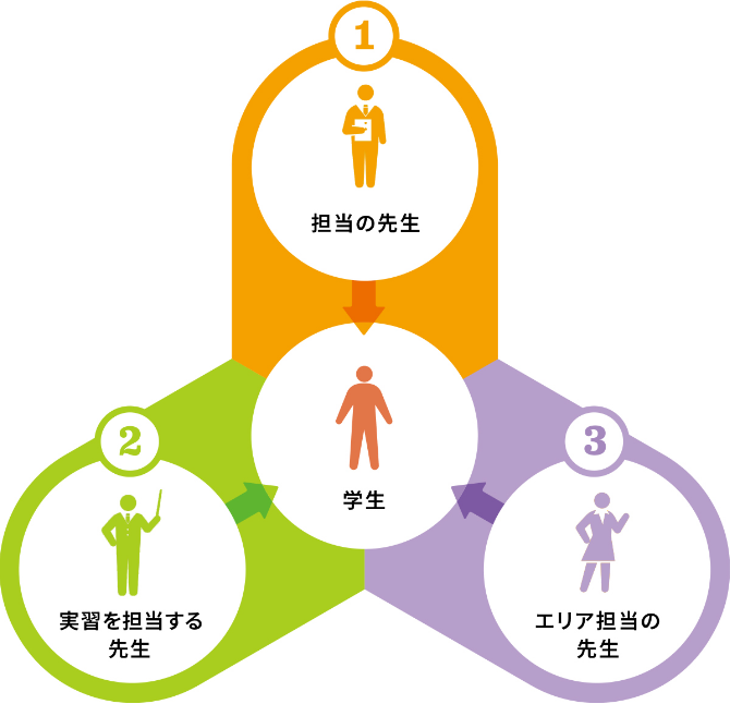 本学では、ひとりの学生の成長を複数の教職員で見守り支える、独自のサポート制度を設けています。短期の目標、長期の将来目標を話しあいながら明確にし、自ら気づき、行動できるチカラを育成しています。