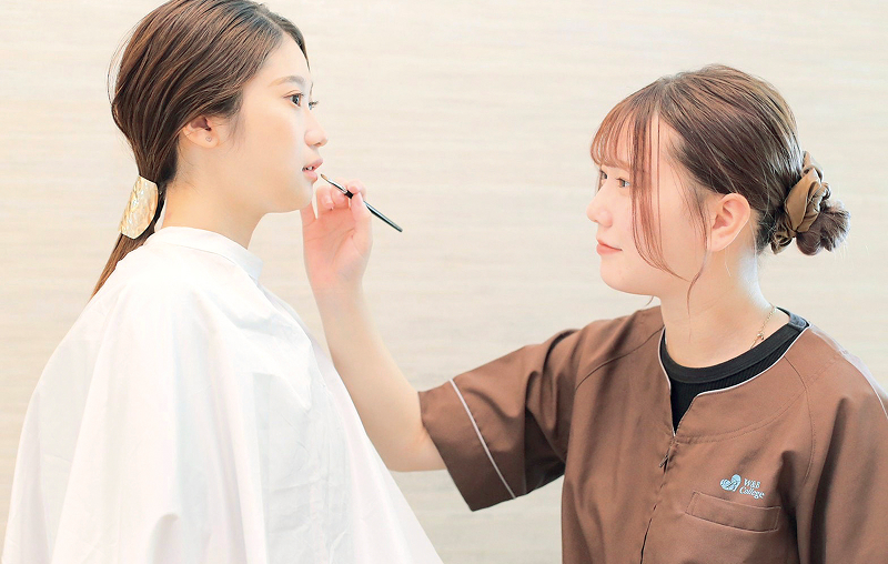 メイクアップの基本をマスターし、資格取得を目指します。花嫁のドレスに映えるメイクも学びます。そして実技としてナチュラルメイクからパーティ向けの華やかなメイクまでを修得します。また、お互いをモデルにしながら実践的に数多くのメイクに挑戦します。