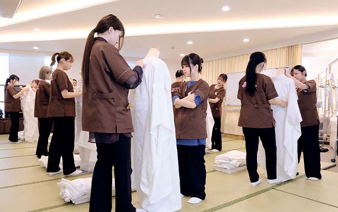 挙式の際に花嫁が着る白無垢や、お色直しの際の色打掛など、特別な着物の着付け方を身につけます。