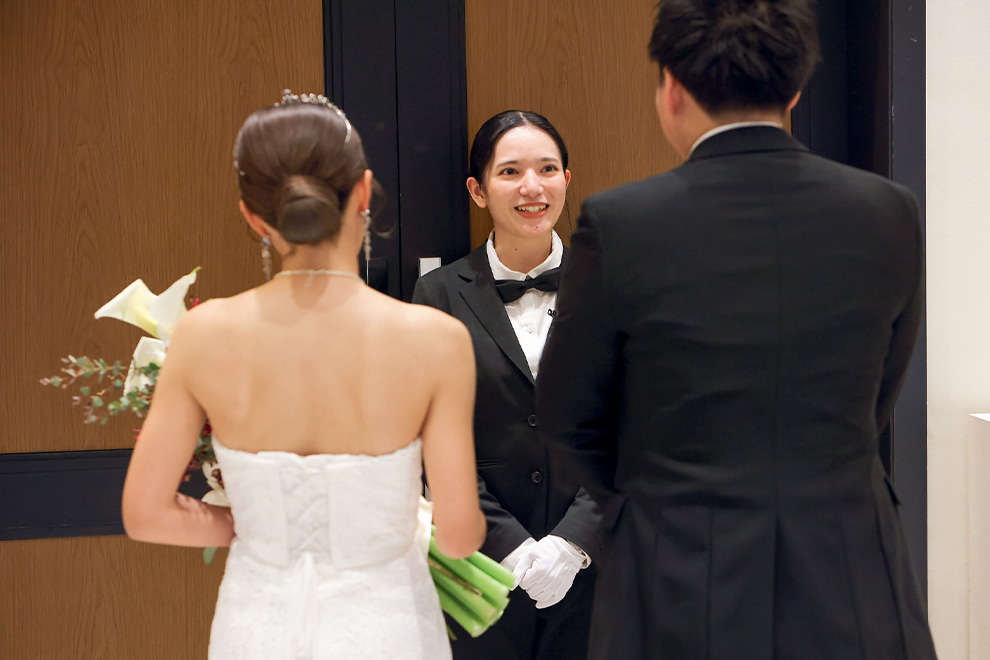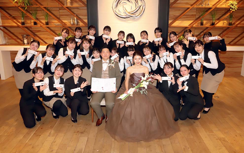 公募した新郎新婦の本物の結婚式をプロデュース!特別な日が最高のものとなるように、最初のお打合わせから当日のアテンドまで、生徒が力を合わせてサポートします。