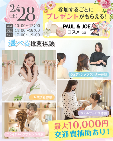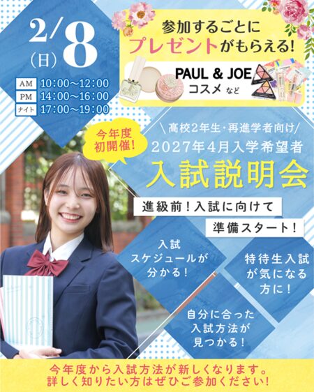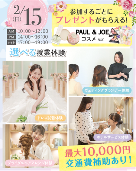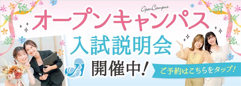 2026.02.02 特典付き!2月オープンキャンパス 高校2年生限定コスメプレゼント!詳しくは各オープンキャンパスをチェック! プロの先生から教えてもらえる大人気の体験授業!ドレスが着られるドレス体験がおすすめ♡ <全日程3部開催>10:00~12:0014:00~16:0017:00~19:00 17:00~は体験内容が異なります! \ご予約は画像をタップ/