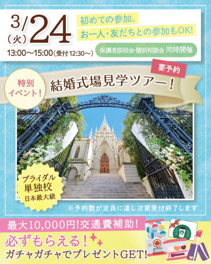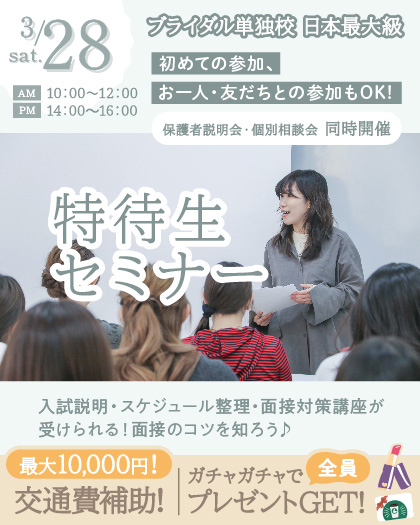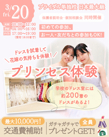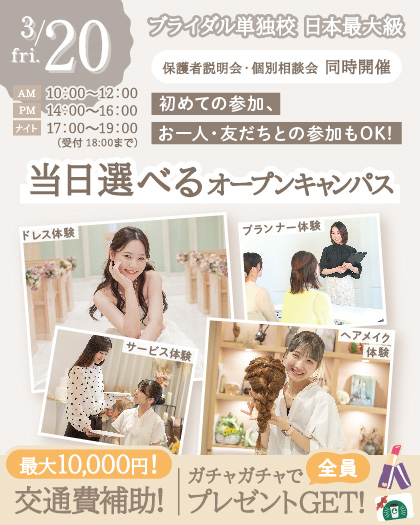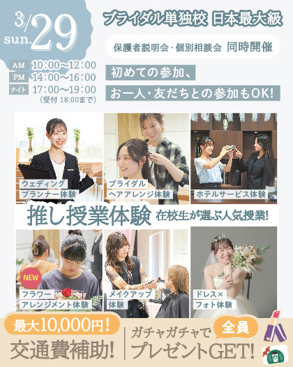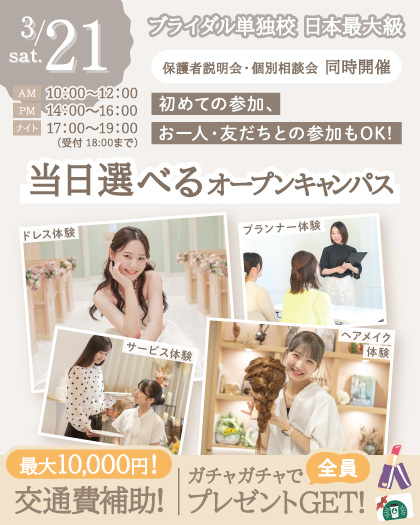 2026.03.16 特典つき!3月オープンキャンパス 大人気の授業体験でブライダルの職種を詳しく知れる!在校生や先生に個別に相談できる! <全日程 3部開催>10:00~12:0014:00~16:0017:00~19:00 17:00~は体験内容が異なります!