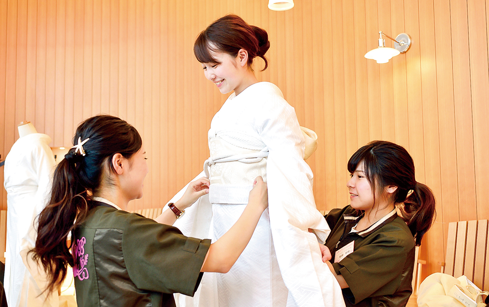 ブライダルに必要な着物に関する知識と技術を学び、在学中に資格取得できる力を育みます。