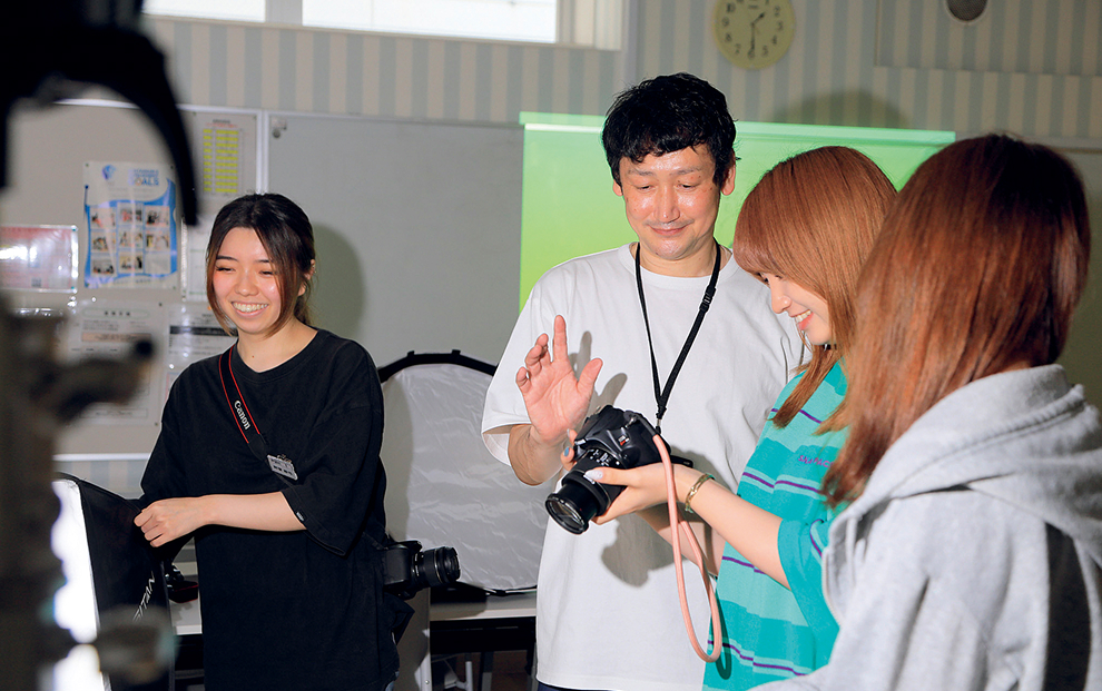 一眼レフカメラで撮影した写真素材をAdobeソフトで編集するなど、本格的な機材・ソフトを使った実習授業です。