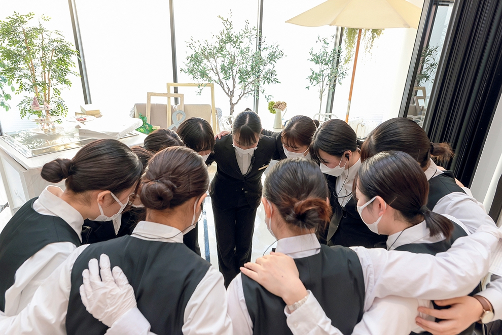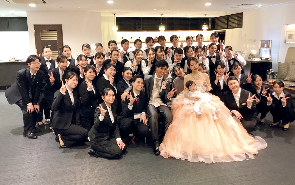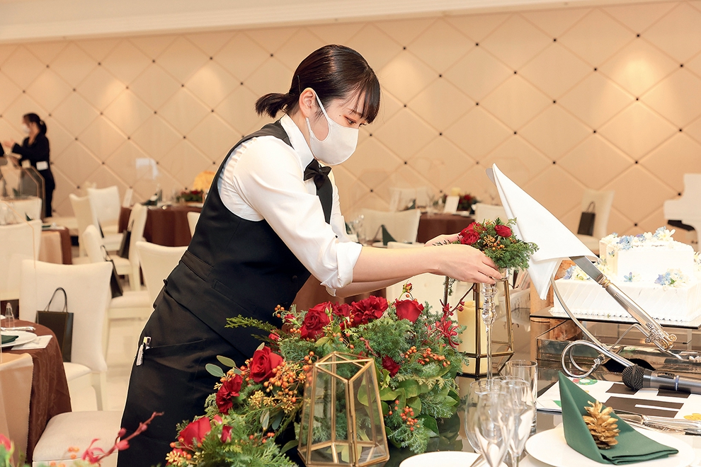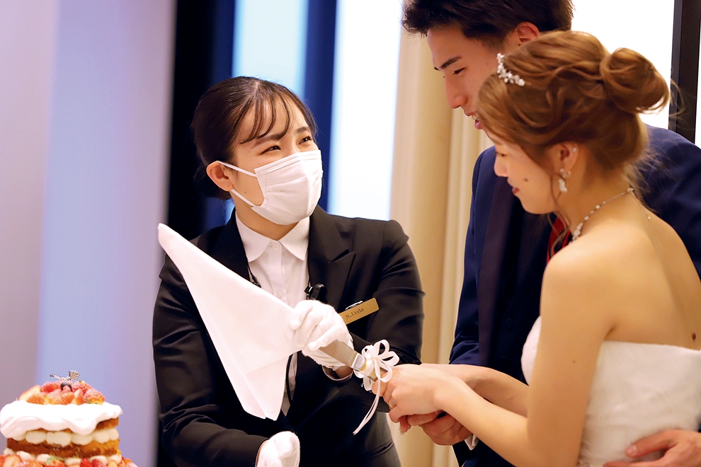 本物の結婚式をプロデュースするにあたって、お客様に安心感を持っていただけるような笑顔や言葉づかい、マナーに気をつけて練習を重ねました。クラス全員がお客様の幸せを創りあげたいという一心で、各セクションが全力を注げたと思います。