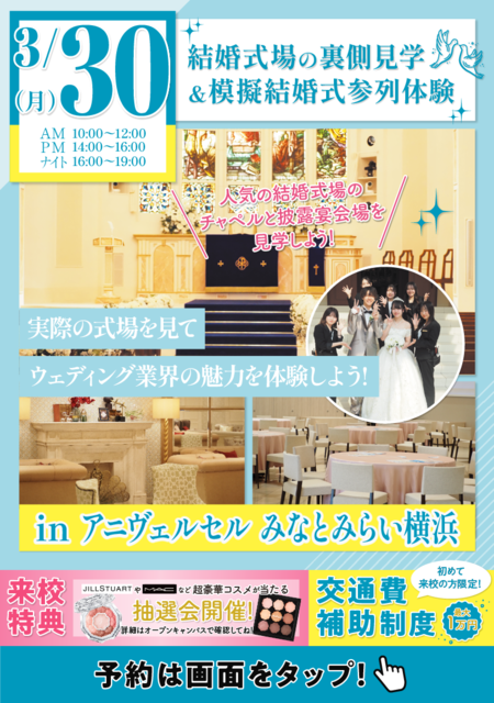 2025.12.01 【高校生・再進学をご検討の方対象!!】春休みに本物の結婚式場に行ってみよう☆ ブライダルのお仕事に興味のある皆さんに素敵なお知らせです✨ なんと・・・!! 本物の結婚式場にてオープンキャンパスを開催します☆ 【会場】アニヴェルセルみなとみらい横浜みなとみらいエリア最大級の結婚式場です! 実際の会場を見学できるほか、ゲスト役として結婚式当日の流れを体験することが出来ます! 毎回ご好評いただいており、予約でいっぱいになることもあるため早めの予約がおすすめ! 画像をタップすると予約画面に進むことが出来ます当日会場でお会いできることを楽しみにしております