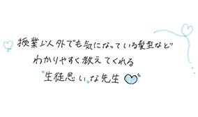 授業の内容や就職など、いつでも気軽に相談できます。前に相談したことを気に掛けてくれたり、名前を憶えてくれていたり…。先生の期待に応えられるようにがんばろう!って思えます。